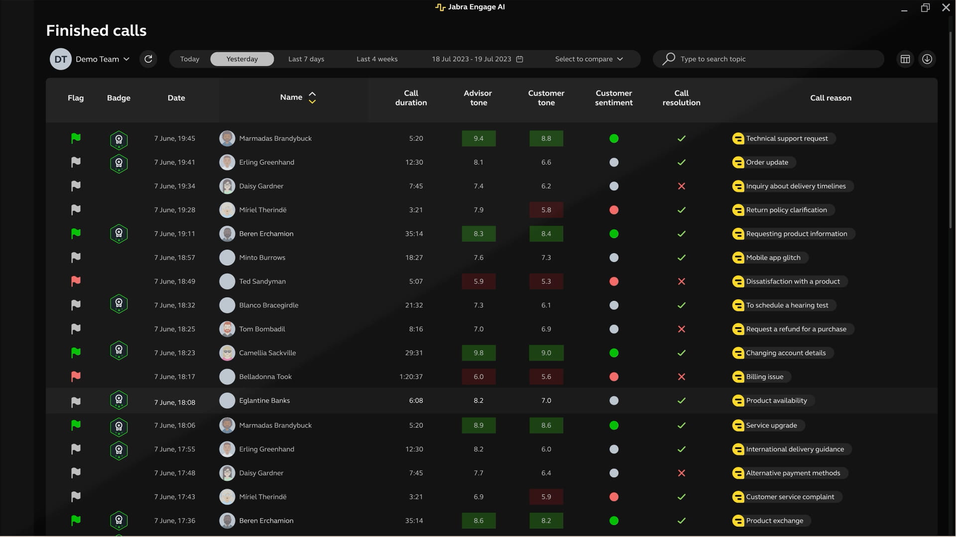 Süpervizörlerin rastgele arama örneklemesine veya düzensiz anketlere güvenmesine gerek yok. Engage AI her aramayı yakalar ve önemli anları, ton değişimlerini ve eğilimleri net, kullanımı kolay bir gösterge panelinde işaretler.