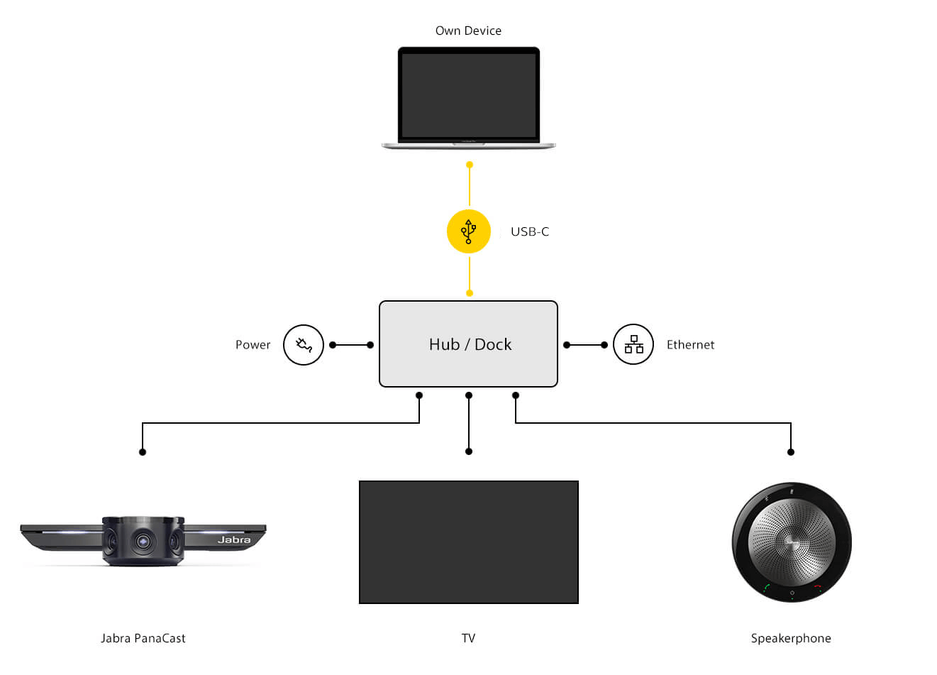 Jabra PanaCast即插即用,也可與連接揚聲器,電視機,電源和互聯網的集線器或擴充埠結合使用,以實現簡單的單電纜用戶接口。