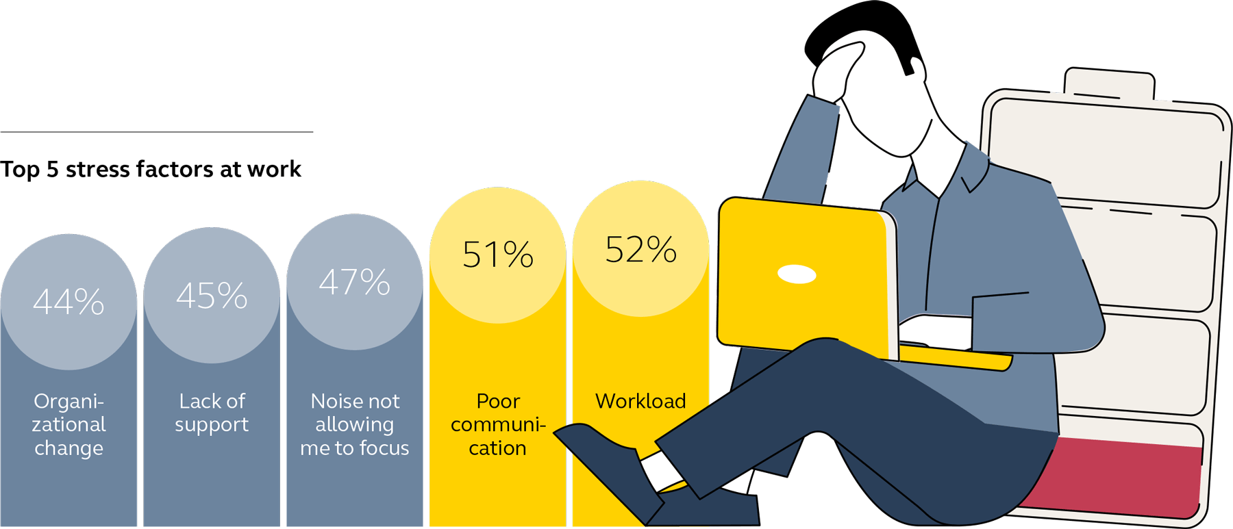 Noise is a significant factor among the numerous stressors knowledge workers often face. Regardless of where they work, evading all noise can be challenging. Even with the flexibility to choose quieter environments, noise remains a top stressor, following closely behind workload and poor communication. Therefore, companies should prioritize addressing noise as a key concern.