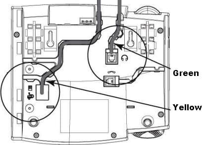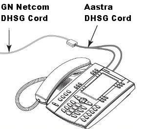 - Enchufe el conector RJ10 (verde) del extremo dividido del cable DHSG de Aastra en la toma/puerto de auriculares con micrófono en el teléfono fijo.