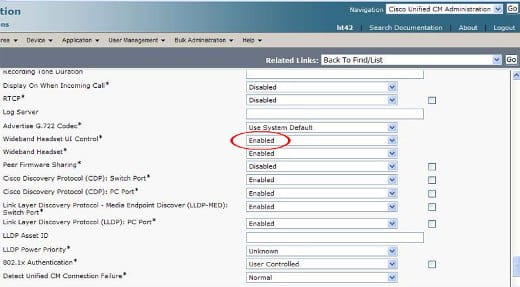 Välilehdellä "Wideband Headset UC Control" (Laajakaistakuulokemikrofonin UC-ohjaus) on valittava vaihtoehto "Enabled" (Käytössä) kunkin puhelimen osalta.