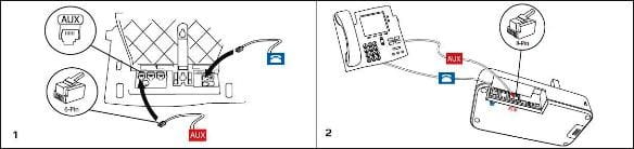 - Connect the Jabra Link 14201-43 EHS cable with the red band to the AUX interface on the headset base and connect the other end to the AUX interface on the Cisco phone.
