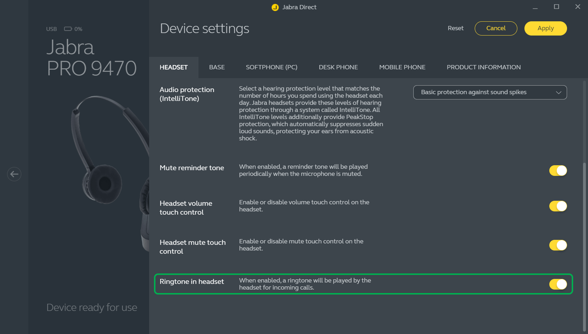 - In Device settings > Headset > Ringtone in headset, click the slider to turn the setting on/off.