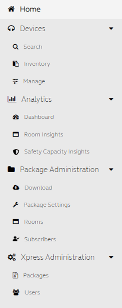 Le menu latéral de Jabra Xpress offre un accès rapide aux fonctionnalités suivantes.