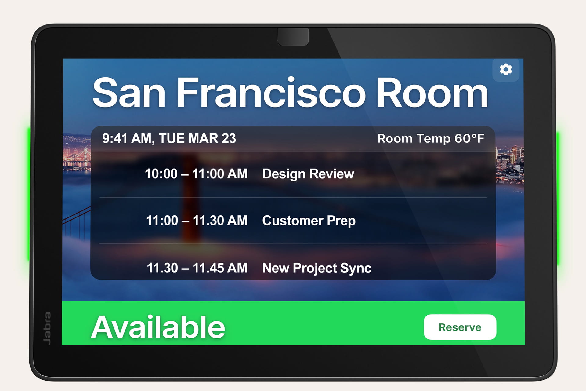 L’écran tactile et le voyant vert indiquent la disponibilité de la salle