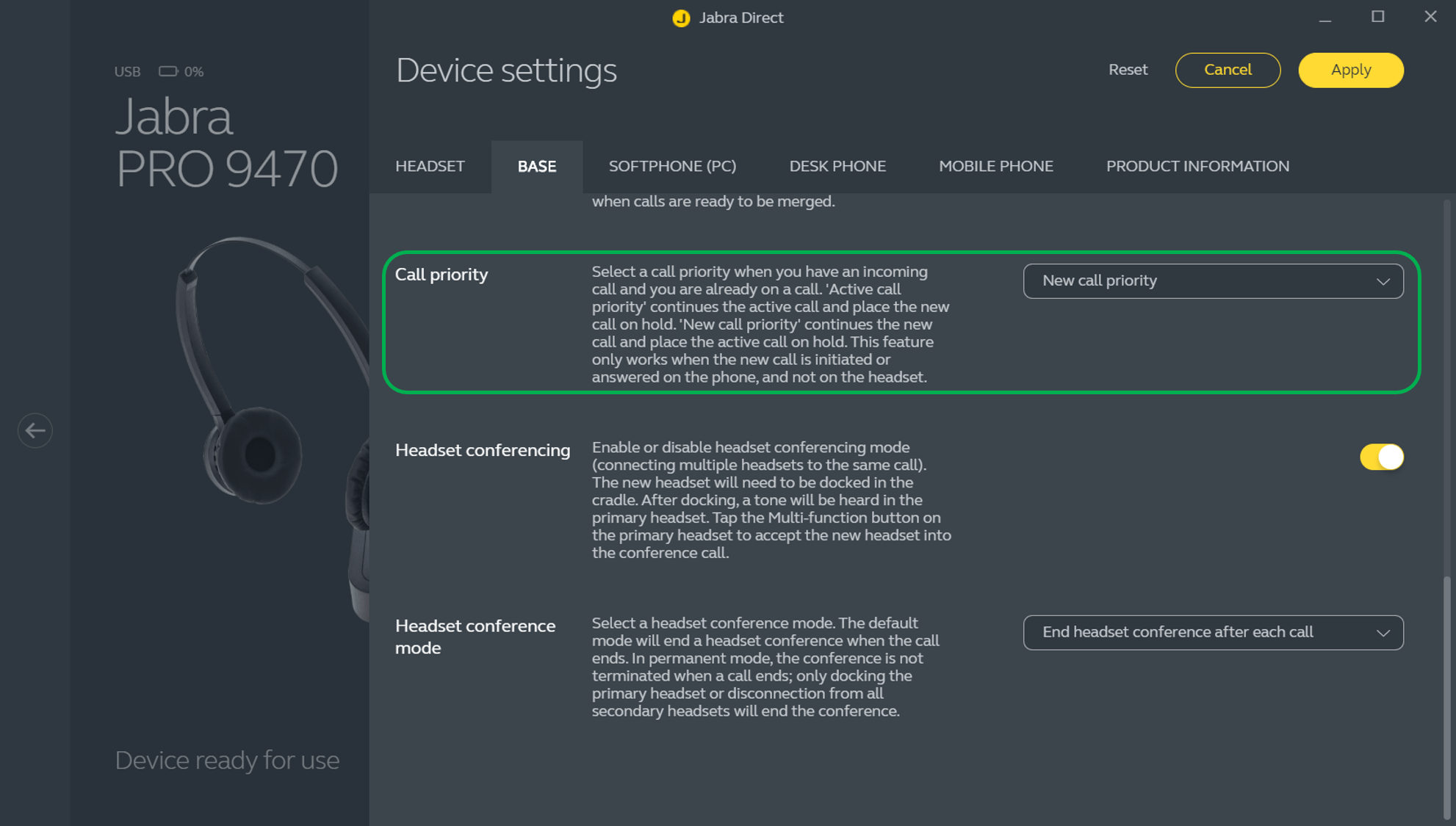 - Em Configurações do dispositivo (Device settings) > Base > Call priority (Prioridade de chamadas), selecione uma das opções a seguir: